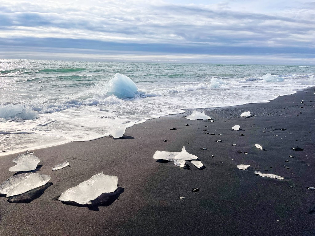 C’est une magnifique plage de sable noir où des morceaux de glaces échouent sur la plage. La lumière du matin est parfaite.