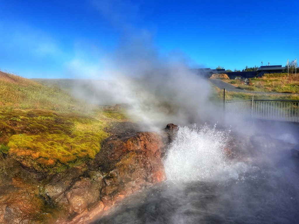 Nous partons maintenant vers le Champ géothermique de Geysir (temps de conduite: 50 mins). C’est un endroit impressionnant et très fréquenté par les touristes. Il y a beaucoup de commodités, comme un grand parking, des hôtels et une station-service. Nous n’avons qu’à traverser la route pour observer les geysers en activité. Geysir lui-même n’est plus actif, mais Strokkur est toujours en éruption aux 8 à 10 minutes. Il est préférable de venir tôt le matin ou en fin de journée, où il y a moins de monde (surtout avant ou après l’arrivée des bus touristiques qui font des excursions d’une journée).
